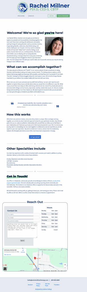 Our goal was to build something that captured the welcoming energy of her and her practice while establishing a clear and powerful SEO presence for her that would allow her to continue to expand into the future. That translated into a bright, airy design that utilizes white space and gentle greens and blues to soften the edges of the text, as well as subtly tinting all of the grey tones with a touch of blue to tie it all together.